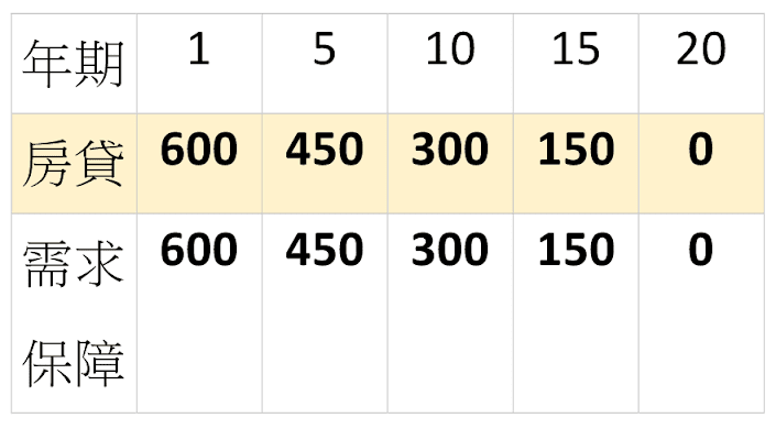 30 歲男性房貸 600 萬為例子,房貸會隨著每年繳款而下降,所需求的保障也會跟著下降。每個月如果房貸繳費 2.5 萬年繳 30 萬。