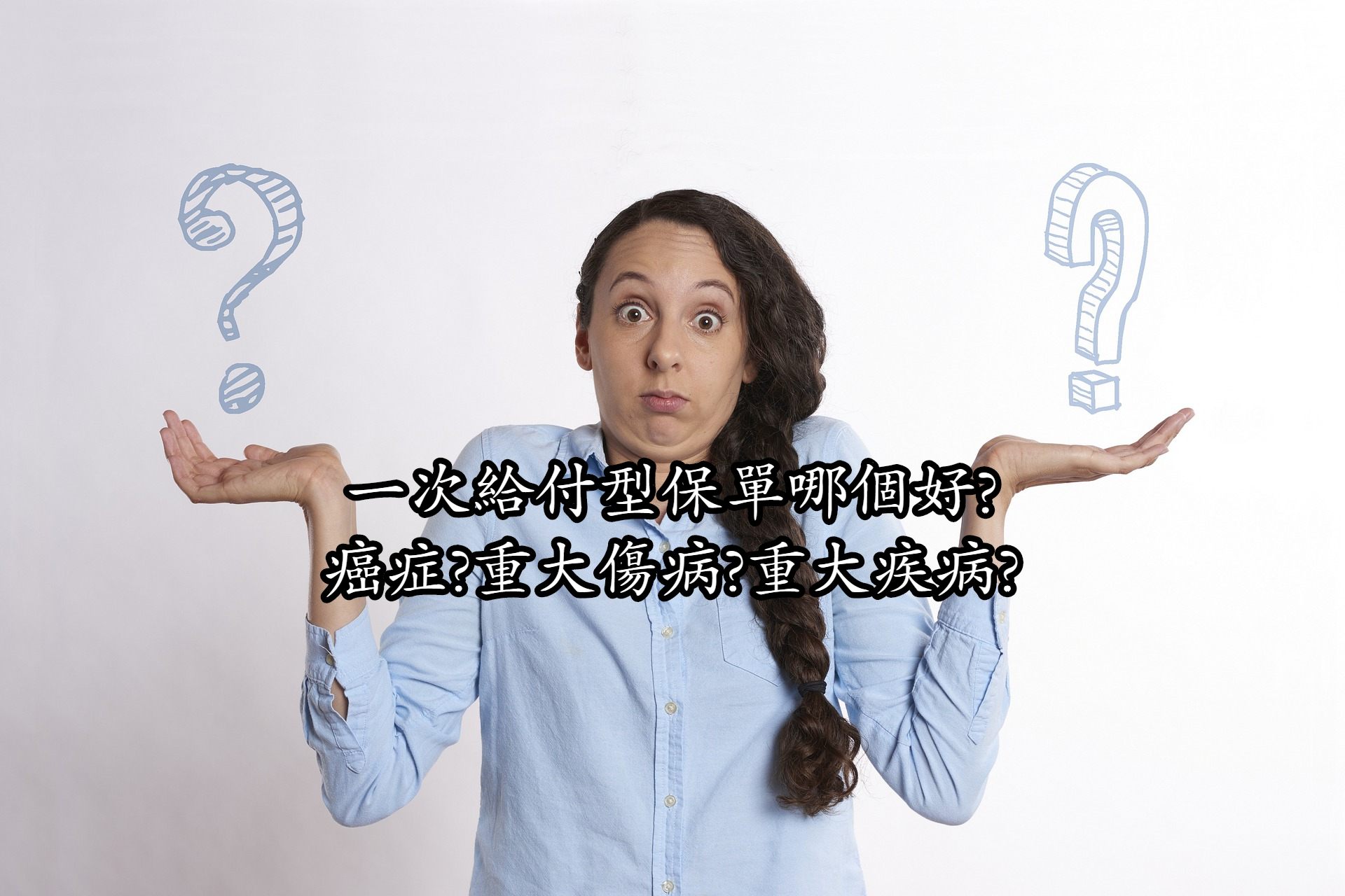看完以上介紹後相信對於想買一次給付型保單的人來說,大家心中應該都有自己覺得適合自己的險種。畢竟最懂得自己想要什麼,需求什麼的都是自己,預算不足買一次給付型癌症險,有預算並且認為未來疾病項目會有改變的人適合重大傷病險,有預算但擔心冠狀動脈繞道手術、急性心肌梗塞(多數重大傷病賠不到)的人可以考慮重大疾病險。