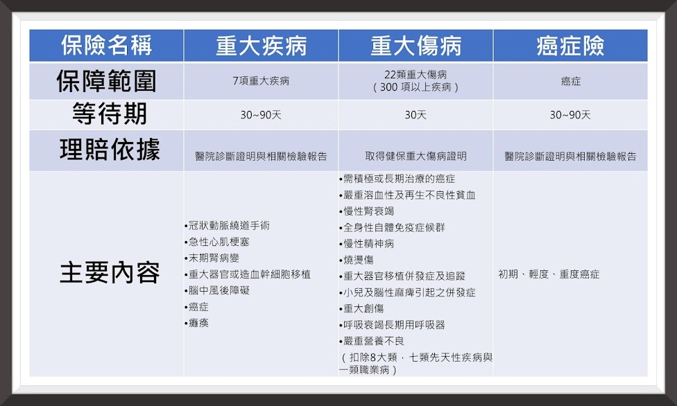 近幾年因為重大疾病理賠定義上困難,所以壽險公司又推出了另一種險種,重大傷病險。這四個都有理賠癌症,但效果跟定義都有所不同,常常讓人看得頭昏眼花。(傳統癌症險、一次給付型癌症險、一次給付型重大疾病險、一次給付型重大傷病險)